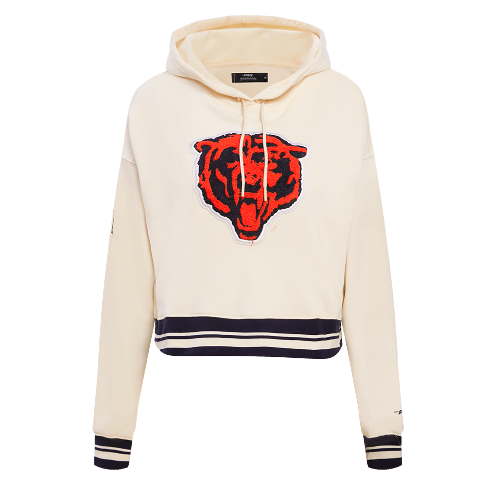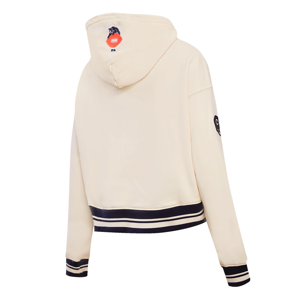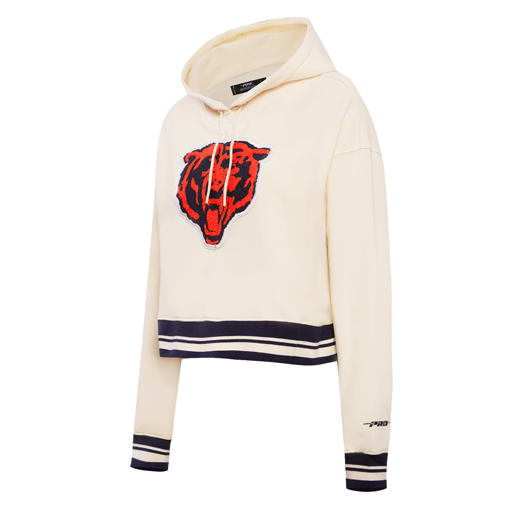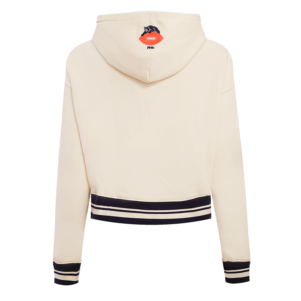 Pro Standard Chicago Bears Retro Classic Cropped Hoodie in eggshell/midnight navy — a premium women's NFL cropped hoodie from the Retro Classic collection featuring heritage-inspired team graphics with retro patches and championship details.