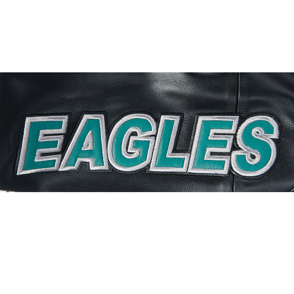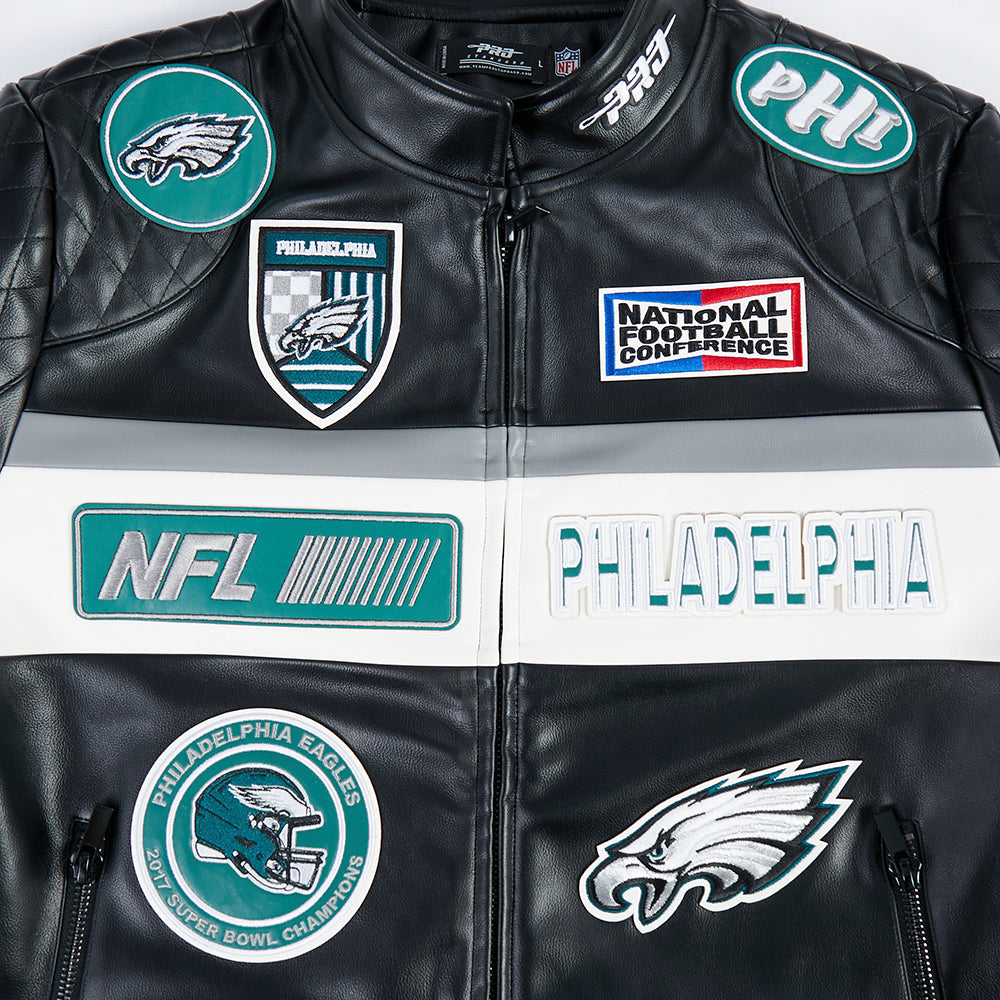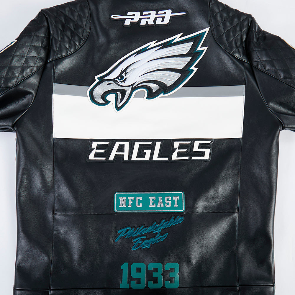 Pro Standard Philadelphia Eagles Moto Jacket Moto Jacket in black/white — a premium men's NFL moto jacket from the Moto Jacket collection featuring premium Philadelphia Eagles team graphics.