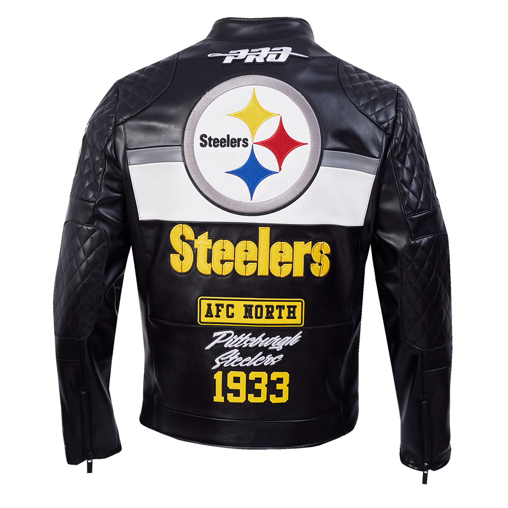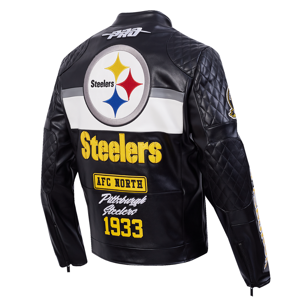 Pro Standard Pittsburgh Steelers Moto Jacket Moto Jacket in black/white — a premium men's NFL moto jacket from the Moto Jacket collection featuring premium Pittsburgh Steelers team graphics.